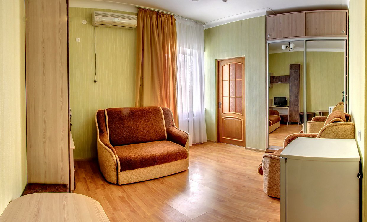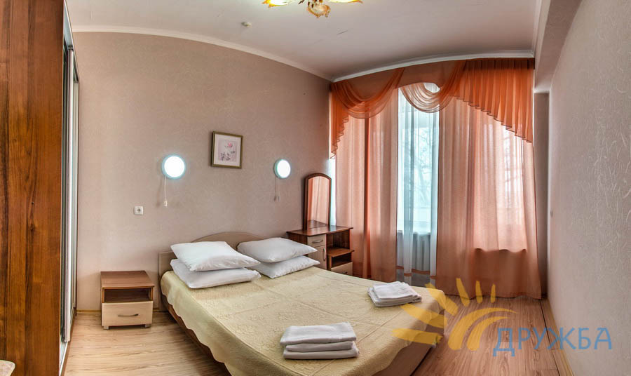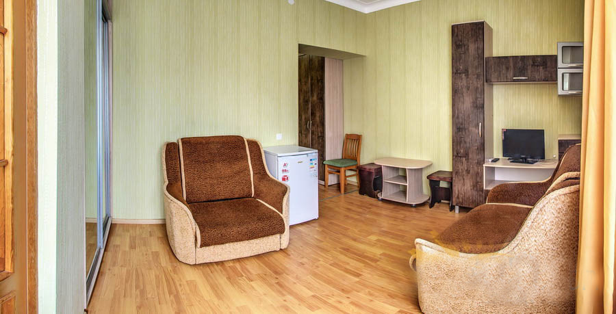 2 осн. места. 2 доп. места. Мебель. Оборудование: кондиционер, телевизор, холодильник. Санузел. Сервис: смена полотенец, смена постельного белья, уборка номера.